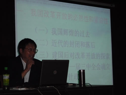 报告分四部分:中国推行改革开放的历史背景、改革开放的历史进程、改革开放三十年的伟大成就和历史经验。报告中,王教授回顾了中华民族辉煌的历史和先人改革、开放的生动事例,重现了1978年“文化大革命”结束时,我们在经济、技术等方面的发展水平和境地,用图文结合的形式展示了我国改革开放三十年的伟大成就,使我们对中国改革开放的必然性和紧迫性有了进一步的了解。王教授指出,改革开放的三十年,是中国经济建设蓬勃发展、政治体制日益完善、文化成果极大丰富、社会建设不断推进的三十年,而这些成就是我们在不断坚持和发展马克思主义、社会主义,加强和改善党的领导,全面推进中国特色社会主义事业的伟大实践中取得的,三十年改革开放的历史经验,也是指导我们实现党的十七大确定的奋斗目标的指针,对推进我们各项事业的健康发展具有重要意义。