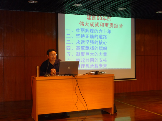 9月22日晚,作为我部“思政课”周的活动之一,全国自然辩证法学会会员、郑州市邓小平理论研究中心研究员、河南省社科专家、十七大精神河南宣讲团成员、郑州市委党校王庸金教授为公司师生作了一场题为《建国60年的伟大成就和宝贵经验》的学术报告。我部全体思政课教师及会计系100多名员工参加报告会。