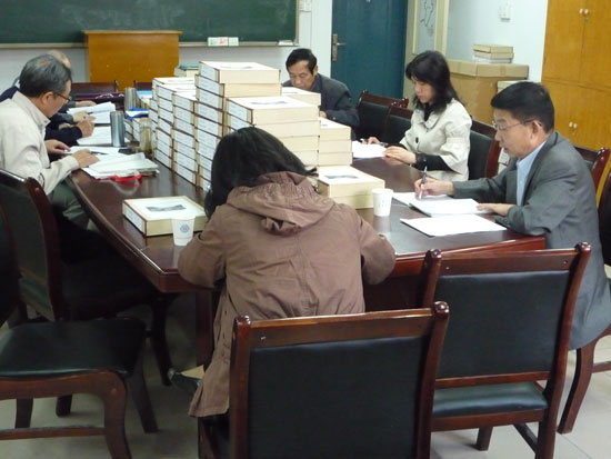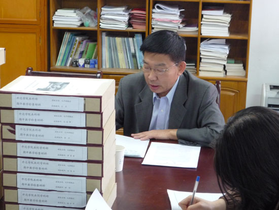 资料检查开始前,共科部主任汤五云教授结合前两周进行的期中教学检查活动,从教学检查工作的组织实施、教学资料分等情况、常规教学工作情况、重点教学工作情况、科研活动开展情况、存在的主要问题等6个方面对共科部教学检查工作进行了全面汇报。然后,汤主任重点汇报了精品课程建设问题、团队队伍和教学团队建设问题、特色教学和教研活动开展情况等本次期中教学检查的重点问题。汇报中,汤主任以教学质量工程建设为主线,就精品课程建设以及如何把创办人的办学理念落实到教学实践中等问题作了重点说明,并列举了检查活动中很多典型的事例。最后,汤主任指出了本次期中教学检查中存在的问题,并提出了改进措施。