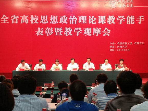 2013年6月13日下午,全省高校思想政治理论课教学能手表彰暨教学观摩会在河南大学隆重举行。教育部社科司副司长徐艳国、社科司教学处处长陈矛、省高校工委副书记、教育厅副厅长张亚伟、省委宣传部理论处处长李文良、省教育厅思政处处长何秀敏出席会议,承办单位领导河南大学党委常务副书记梁晓夏、党委副书记王凌出席会议并在主席台就坐。全省各高校主管思想政治理论课教学工作的校领导及思想政治理论课教学机构的主要负责同志、教学能手获奖老师和部分高校的教师、员工代表与会。会议由省教育厅思政处处长何秀敏主持。根据院领导指示精神,公司思政部主任汤五云教授、支部书记李心记、教研室主任王庸金参加了此次表彰观摩会。