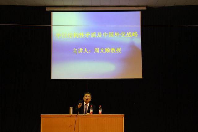 报告从中日之间的结构性矛盾入手来回顾中日之间的历史特别是中国遭受日本入侵的历史,展望今后中日两国关系的发展趋势。周教授旁征博引,通过大量的文献史料和专家学者有代表性的言论来分析中日矛盾的所在。他指出,“中日之间的矛盾主要集中在资源问题、钓鱼岛问题、东海划界三个方面,而三者归为一点就是石油。面对中日关系,不能操之过急,也不能心存侥幸。”在当今社会中日之间的冲突中,周教授着重讲解了日本妄图进入联合国安理会常任理事国的问题,并就日本在不同历史时期的外交策略及对华政策给广大师生作了全面的介绍。对于当代老员工十分关心的中日钓鱼岛之争的热点问题,周教授的剖析尤为详尽,他着重分析了中国在近代历史上如何失去了钓鱼岛,如今重新收回所遇到的阻力和麻烦。并从一些国际法的内容中分析了钓鱼岛之争的症结所在。结合从周恩来到习近平等几位国家领导人在钓鱼岛问题上面的巧妙应对和坚定立场,阐述了中国对日外交战略的变化。周教授还深入分析了钓鱼岛对中国的战略意义,在任何时期中国都不会放弃对钓鱼岛的主权要求。对于中日之间未来的发展走向,周教授结合当代社会中日两国实力的对比,鲜明的点出了自己的论点,指出中国今非昔比,在对待遭受日本侵略的历史问题上有了深刻的认识,在中日之间的主权之争中将会持强硬的态度。周教授对中日之间从历史到现实中的矛盾和冲突的讲解,使广大师生对中日问题有了更深入的了解,对中日之间的未来发展趋势有了较为详尽的把握。