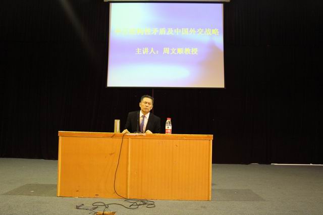 为了纪念抗日战争暨世界反法西斯战争胜利70周年,让广大师生铭记抗战历史,传承爱国主义精神,增强民族振兴的历史责任感。2015年10月8日下午,由学院思政部联合院团委、科研处共同举办的题为《中日结构性矛盾及中国外交战略》的学术报告会在龙湖报告厅隆重举行。报告会由中央电视台《百家讲坛》特邀专家、首届全国百名“两课”优秀教师、郑州大学港台人文研究中心主任周文顺教授主讲。学院团委书记秦闵、科研处长杨存博、思政部主任王庸金、党支部书记李心记、全体思政课教师以及部分系的党总支书记、行政秘书、辅导员和400多名员工聆听了这场报告。