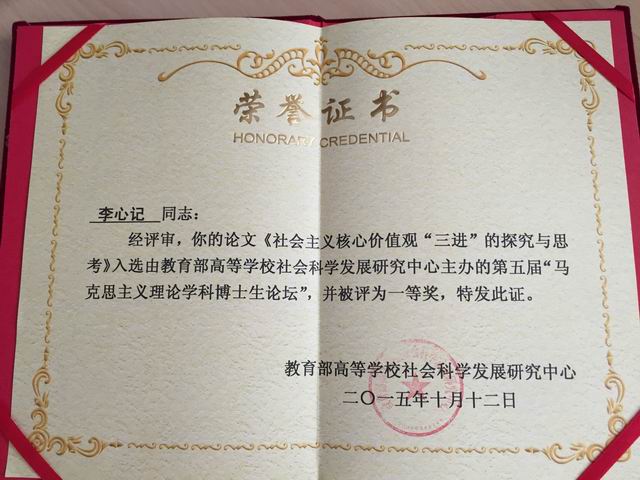 2015年10月17日,由教育部高等社会科学发展研究中心主办,山东师范大学承办的“第五届马克思主义理论学科博士生论坛暨中国特色社会主义理论体系研讨会”在山东济南召开,来自于各大高校的专家教授以及44名马克思主义理论学科博士研究生参加此次会议。此次博士生论坛主题是“培育和践行社会主义核心价值观”,党支部书记李心记副教授向大会提交了《社会主义核心价值观“三进”的探究与思考》一文。此次博士生论坛共收到论文130多篇,教育部高等社会科学发展研究中心组织专家学者评出44篇参加会议,继而从44篇论文中评选出5篇文章作为此次论坛一等奖。李心记副教授获会议论文一等奖,并作了10分钟的大会主题发言。