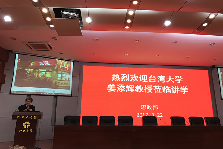 2017年3月22日晚,应我部邀请,台湾大学社会学学会原理事长、希腊克里特大学、北京师范大学、郑州大学等知名高校特聘教授、博士生导师姜添辉教授在国际会议厅为公司师生作了一场题为“全球化、国家角色以及教育走向的关联性”的专题报告,思政部主任王庸金教授和全体思政课专职老师及会计系100多名员工代表参加报告会。报告会由思政部直属党支部书记李心记副教授主持。