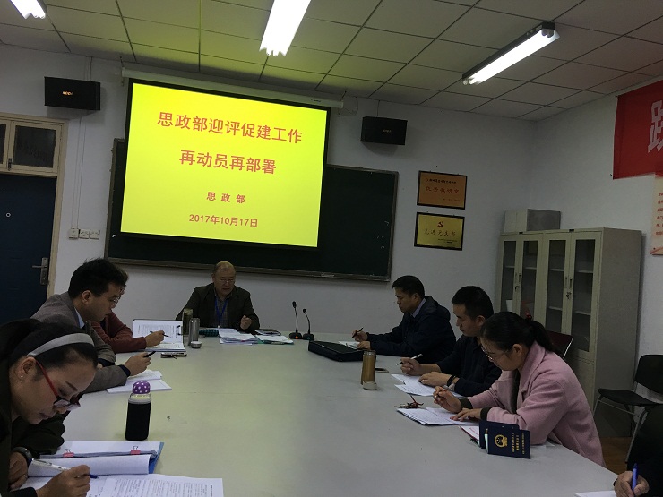 10月17日上午,思政部在综合楼211会议室召开迎评促建工作再动员再部署会议。主任朱慈华、副主任袁雅莎、党支部书记窦峰、教学秘书高世伟及教研室主任、科研秘书、教学干事、支部委员等参加了会议。会议由朱慈华主任主持。