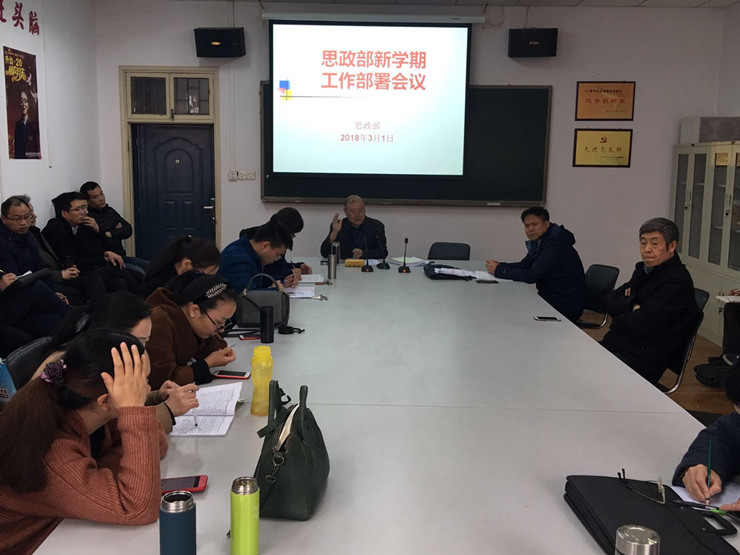 3月1日下午,思政部全体教职工在综合楼211会议室召开2017-2018年第二学期第一次会议,认真组织学习董事长和校领导在教职工大会上的讲话精神,并结合思政部实际情况,部署迎评促建和新学期工作。会议由朱慈华主任主持。