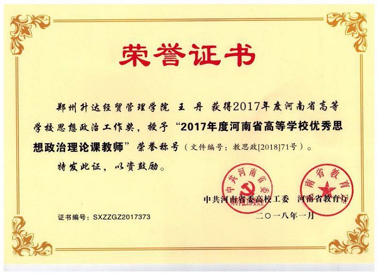 近日,由河南省委高校工委、河南省教育厅组织开展的“2017年度河南省高校思想政治工作奖”评选结果揭晓,思政部教师王丹荣获河南高等学校优秀思想政治理论课教师称号。