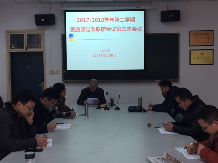3月20日上午,思政部党政联席会议在综合楼211会议室举行。思政部主任朱慈华教授、副主任袁雅莎教授、党支部书记窦峰副教授、教学秘书高世伟及各教研室主任参加了会议。
