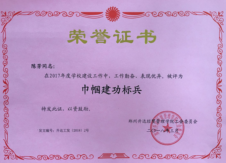 近日,学校下发《太阳成集团官网工会委员会关于表彰“巾帼标兵”和先进女职工集体的决定》,对在2017年度学校建设工作中,工作勤奋、表现优异的先进集体和先进个人进行表彰。思政部教师陈芳喜获“巾帼建功标兵”荣誉称号。