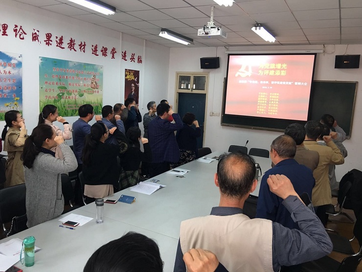 然后,在窦书记的带领下,全体党员教师举行了“争先锋,作表率,迎评促建做贡献”誓师大会,全体党员教师伸出自己的右手,口述誓词:“不忘初心,牢记使命。立德树人,贯彻始终。迎评促建,力争全胜。课堂教学,认真负责。严守纪律,坚守底线。各项任务,坚决完成。严谨细心,杜绝漏洞。尽心尽力,为校争光。”,全体教师庄严宣誓,力争为学校评建工作的顺利进行贡献自己的力量。