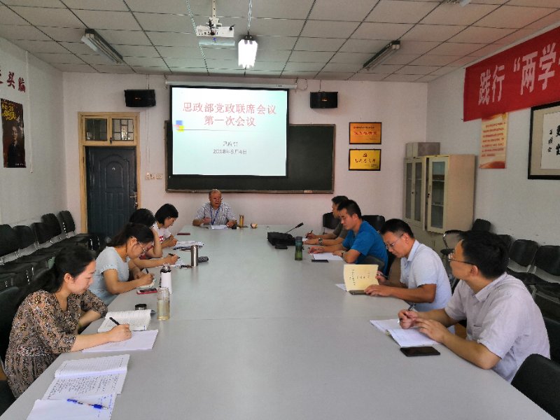 9月4日上午,综合楼211会议室,思政部召开新学期第一次党政联席会议,研究部署新学期工作。会议由思政部主任朱慈华教授主持,副主任袁雅莎教授、党支部书记窦峰副教授、教学秘书晏玲玲和各教研室主任参加了会议。