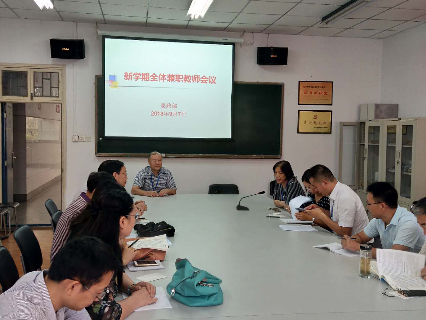 思政部于9月7号上午在综合楼211会议室召开了新学期全体兼职教师会议,会议由主任朱慈华教授主持,副主任袁雅莎教授、教学秘书晏玲玲和各教研室主任参加了会议。