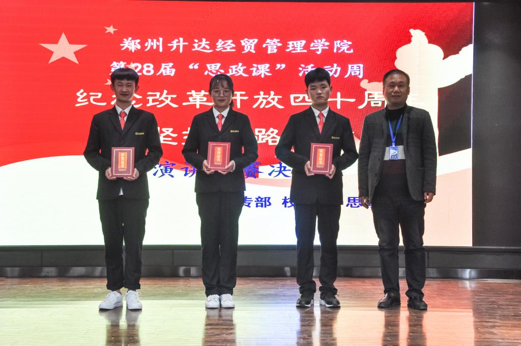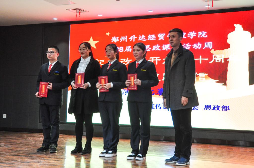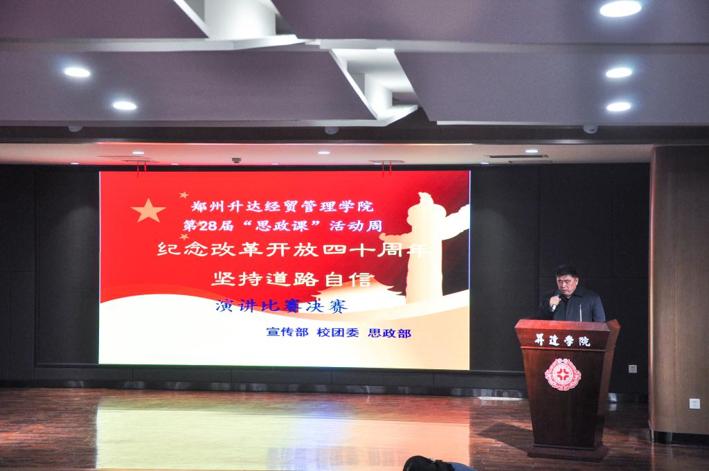 11月13日晚7点,太阳成集团官网第28届“思政课”周“庆祝改革开放四十周年坚持道路自信”演讲比赛在创业大讲堂隆重举行。经过推荐、初赛、预决赛层层选拔,最终10位同学参与决赛,致敬改革开放四十周年。公司党委副书记兼纪委书记戎庭银、副董事长兼教务长吴益民、党委宣传部部长兼新闻中心主任职正路、党委宣传部陈军、思政部主任朱慈华、思政部党支部书记窦峰、校团委副书记李松涛、陈芳及学校师生代表观看了比赛。