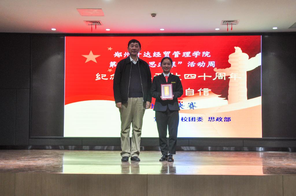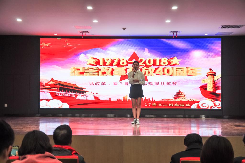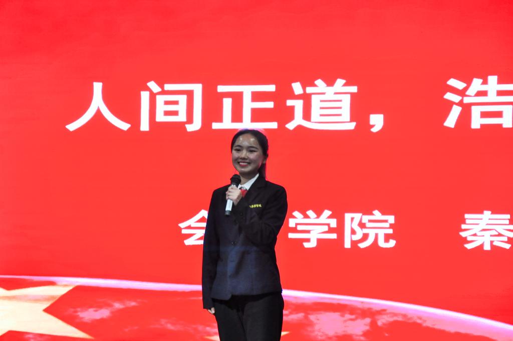 “改革春风暖人间,神州大地百花研,改革,让神州大地迸发出勃勃生机,开放,使封闭的中国拥抱整个世界,从此开辟出了一条中国特色社会主义的复兴之路。40年风雨兼程,砥砺奋进,40年栉风沐雨,春华秋实。中国已经走到了世界舞台的中央,翻天覆地40年,久经磨难的中华民族实现了从站起来,富起来,到强起来的历史性飞跃。展未来,习近平总书记在11月5日召开的首届中国国际进口博览会开幕式上说‘经历了无数次狂风暴雨,大海依旧在那儿!经历了5000多年的艰难困苦,中国依然在那儿!面对未来,中国将永远在这儿!’”。2018级会计二班秦梦瑶在题为《人间正道,浩荡前行》的演讲中,从改革开放40年间中国举办的世界级会议和港珠澳大桥的建设等国内一些列令世人瞩目的成就来谈改革开放对国家和青年的影响力。她铿锵有力的嗓音、流畅的表达、丰富的中国成就和精彩的变现征服了在座的所有老师和同学们,并获得了本次大赛的一等奖。