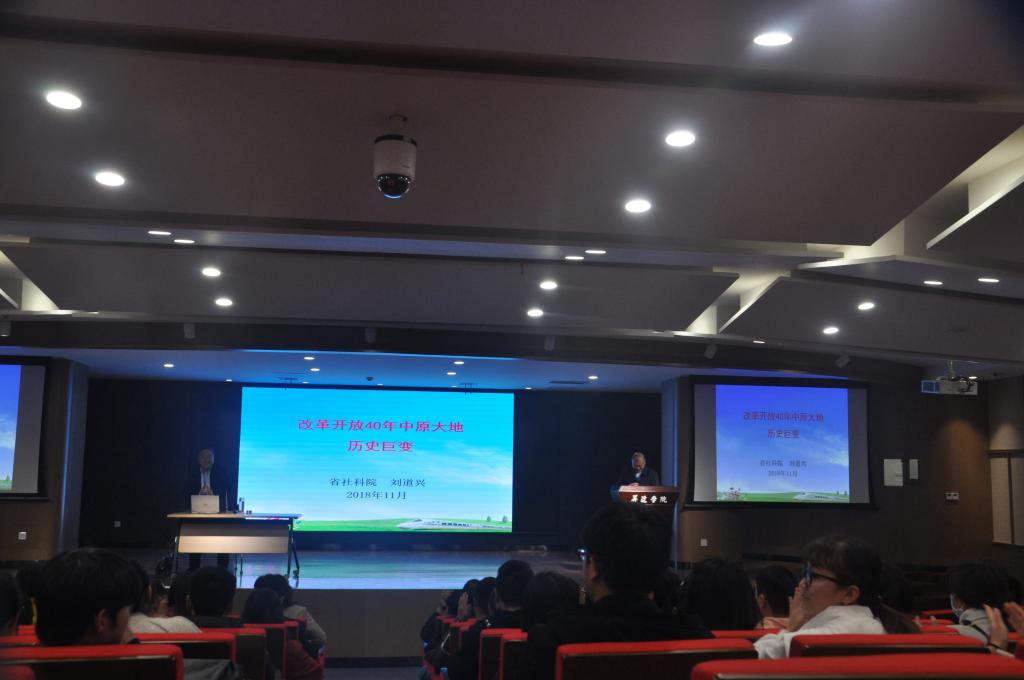 为庆祝改革开放四十年,11月15日下午,思政部组织了庆祝改革开放四十年报告会,邀请了河南省社科院原副经理刘道兴研究员莅校在创业大讲堂为广大师生做了一场题为《改革开放40年中原大地历史巨变》的报告。思政部主任朱慈华教授参加并主持报告会,思政部全体员工及部分员工代表共200多人参加了报告会。