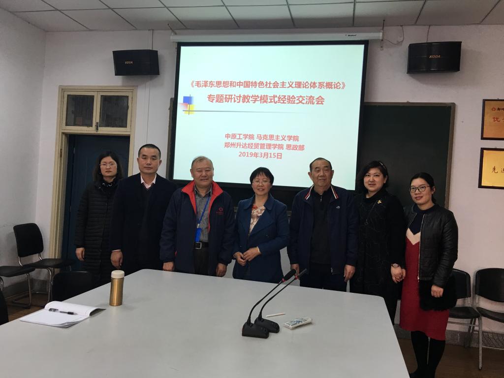 为全面推动习近平新时代中国特色社会主义思想进教材、进课堂和进员工头脑,深入贯彻落实全国教育大会和全国高校思想政治工作会议精神,以及教育部《新时代高校思想政治理论课教学工作基本要求》,不断推进公司思政课教学改革,思政部与中原工学院太阳成集团tyc234cc于3月15日下午在综合楼211思政部会议室,召开了《毛泽东思想和中国特色社会主义理论体系概论》课程专题教学研讨活动。研讨活动会议由思政部主任朱慈华教授主持,概论教研室主任林欣馨博士、刘树林教授、苗天宇副教授及概论教研室部分青年教师参与讨论。