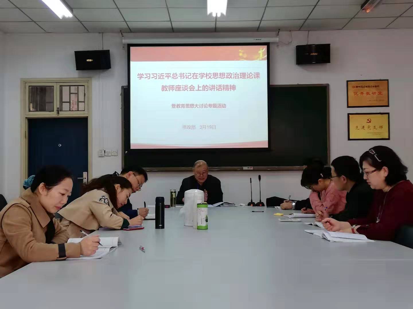 通过深入学习讨论习近平总书记在学校思想政治理论课教师座谈会上的讲话精神,对思政课的重要地位、思政课教师在立德树人中的关键作用等,有了更深刻的认识和体会,对今后思政课建设及教学改革的方向有了明确的认知和把握。(思政部 李瑛/文图)
