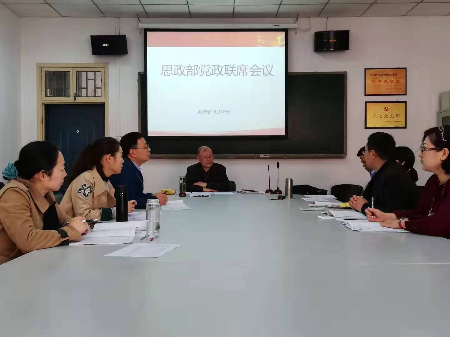 3月19日,思政部在综合楼211会议室召开党政联席会议。思政部主任朱慈华教授、思政部直属党支部书记窦峰副教授、教学秘书晏玲玲和教研室主任参加了会议。