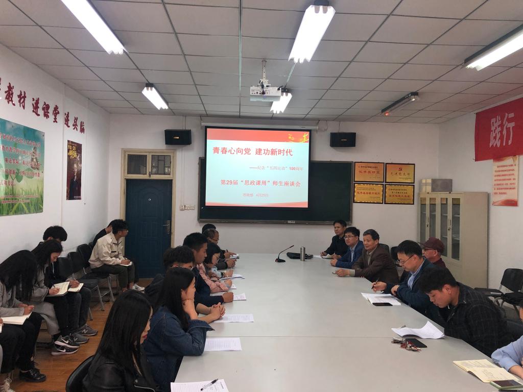 4月25日下午,在综合楼211会议室,思政部根据第29届“思政课活动周”方案,组织了“青春心向党,建功新时代——纪念五四运动100周年”师生座谈会,校团委书记李霄锋、思政部直属党支部书记窦峰以及部分教师、员工代表参加。座谈会由窦峰书记主持。