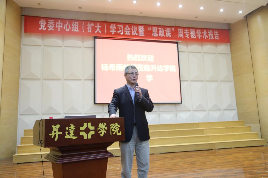 为深入学习贯彻习近平新时代中国特色社会主义思想,进一步加强公司思想政治工作建设,帮助广大师生全面了解国际形势特别是中美关系,郑州升达经贸管理公司党委中心组(扩大)学习会议暨第29届“思政周”专题学术报告会,4月26日下午在艺术楼音乐厅举行,特邀中国国际问题研究院研究员、央视特约评论员、原外交部朝鲜半岛事务办公室主任、中国驻美国大使馆和中国常驻联合国代表团参赞、国务院特殊津贴专家杨希雨教授,为公司师生做《当前中美关系中的热点问题与发展趋势》专题学术报告会。常务副董事长崔慕岳教授、副董事长张金安、副董事长兼教务长吴益民教授、全校科级以上领导干部、全体思政课教师及部分师生代表参加了报告会。副董事长兼教务长吴益民教授主持专题学术报告会。