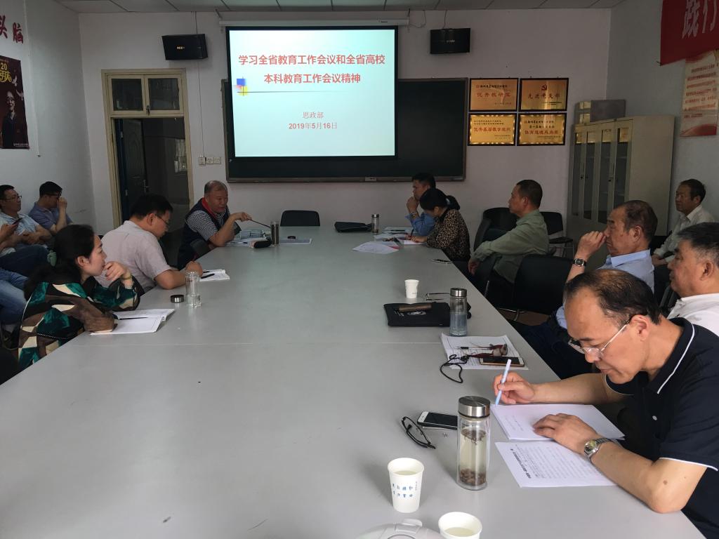 5月16日下午,思政部在综合楼211会议室进行了教育思想学习活动,着重学习了我省在4月29日召开的全省教育大会和4月19日召开是新时代全省高等学校本科教育工作会议精神。思政部主任朱慈华教授、思政部直属党支部书记窦峰副教授、教学秘书晏玲玲及全体教师参加了会议。