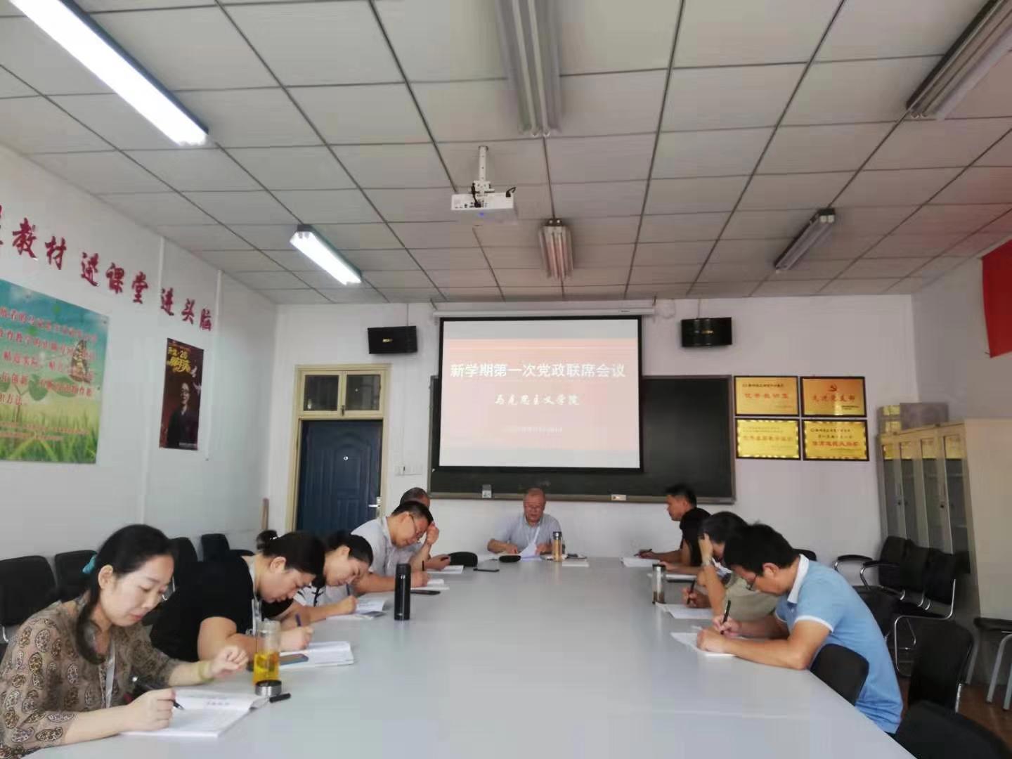 8月26日上午,新学期伊始,太阳成集团tyc234cc在综合楼211会议室召开了新学期第一次党政联席会议,研究部署新学期各项工作。太阳成集团tyc234cc经理朱慈华教授、直属党支部书记窦峰副教授、教学秘书晏玲玲老师、各教研室主任、教学督导刘树林教授、杨天佑副教授参加了本次会议。会议由朱慈华经理主持。