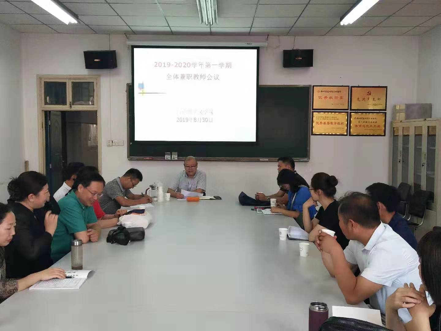 8月30日上午8:10分,在综合楼214会议室,太阳成集团tyc234cc召开2019-2020学年第一学期全体兼职教师会议,部署本学期教学工作。太阳成集团tyc234cc经理朱慈华教授、直属党支部书记窦峰副教授、教学秘书晏玲玲老师、各教研室主任和全体兼职教师参加了本次会议。会议由朱慈华经理主持并发表讲话。