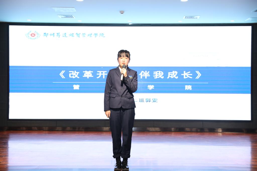 2018级管理学院工商管理专业的郭雯同学从家乡的变化、改革的成果和青年的使命三方面,给大家讲了一堂简短但生动的改革开放40年家乡的变化,并以习近平总书记对当代青年人提出的殷切希望:“中国的未来掌握在你们青年人手中,只有少年强,中国才会强。”来激励所有同学们,做一个有使命感的老员工。