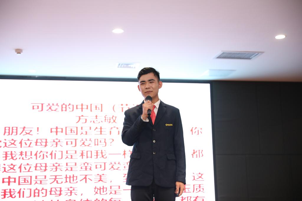 2019级商学院电子商务专业的曹春正首先从老百姓们的衣食住行4各方面来展示祖国建国70年的艰辛历程,接着以自己的爷爷、父亲到自己这样的家庭传承画面,生动的阐释了祖国不断强大背景下一个普普通通家庭受到的影响,最后他借用习近平总书记在参观《复兴之路》时提出的:“现在,我们比历史上任何时期都更接近中华民族伟大复兴的目标,比历史上任何时期都有信心,有能力实现这个目标。”来引导在坐师生思考如何传承国家赋予一代代中华儿女的重大责任,尤其是青年一代要做有理想、有本领、有担当的时代新人,中华民族伟大复兴的中国梦终才能在一代代青年的接力奋斗中变为现实!