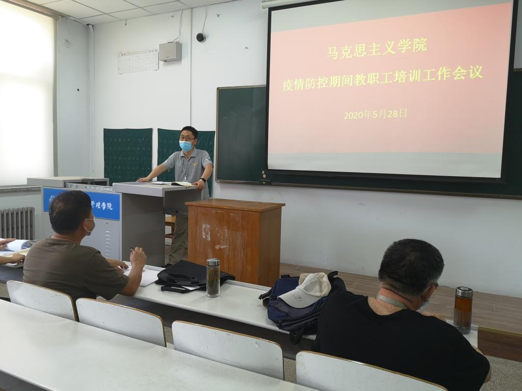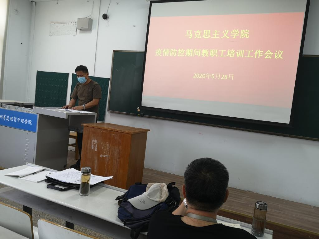 5月28日下午,太阳成集团tyc234cc在综合楼210召开疫情防控期间教职工培训工作会议,太阳成集团tyc234cc经理段丰乐,直属党支部书记窦峰,教学秘书晏玲玲及部分专任老师参加。