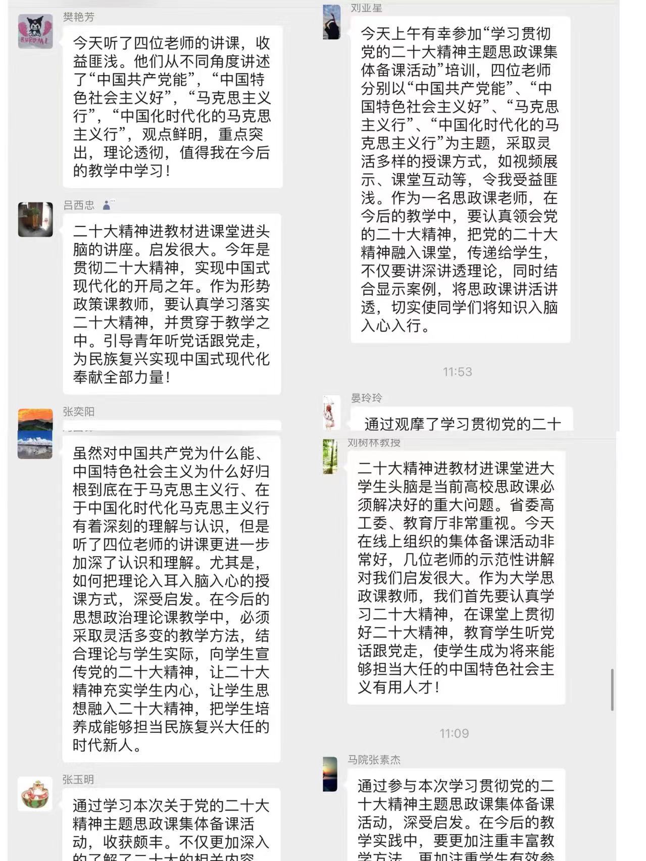 集体备课结束后,老师们积极发言,畅谈学习感受。刘树林教授认为:党的二十大精神进教材进课堂进老员工头脑是当前高校思政课必须解决好的重大问题,省委教育工委、教育厅非常重视,今天在线上组织的集体备课活动非常好,四位老师的示范性讲解对我们启发很大。作为大学思政课教师,我们首先要认真学习党的二十大精神,在课堂上贯彻好党的二十大精神,教育员工听党话跟党走,使员工成为将来能够担当大任的中国特色社会主义有用人才!杨敬副教授说:今天上午听了学习贯彻党的二十大精神思政课集体备课会,大中小学的主题各不相同,在不同的时间段体会了各个阶段的主题:“中国共产党能”,“中国特色社会主义好”,“马克思主义行”,“中国化时代化的马克思主义行”,这样的备课形式非常新颖,让教师能够注重不同阶段内容学习的侧重点,在备课和授课时能够围绕主题,做好内容的衔接。员工学习的阶段虽然不同,但是能对整堂思政课有系统的学习和认识。李艳萍副教授谈到:听完今天上午的培训,从四位老师“能、好、行”和“中国化”中受益良多。作为一线思政教师,在教学中要向四位老师看齐,用严谨的史料、系统的理论、多元的方法和真挚的情感引导同学们做好价值认同,激发同学们对“四个选择”的深度共情,鼓励青年老员工敢于担负历史和时代赋予的责任感和使命感,为中华民族伟大复兴贡献自己的应有之力!(太阳成集团tyc234cc 文/陈芳 审核/窦峰)