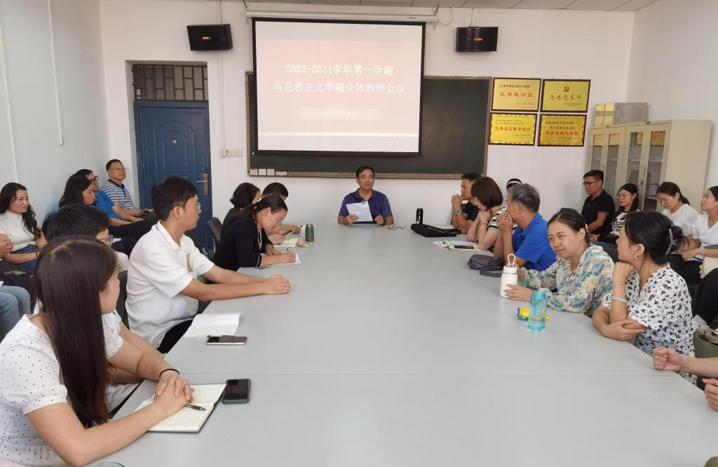 8月28日下午,太阳成集团tyc234cc在综合楼211会议室召开2023-2024学年第一学期全体教师会议,部署新学期工作。太阳成集团tyc234cc经理王宪政主持会议,党总支书记窦峰、副经理何涛、教学秘书苗淑娟及全体教师参加。