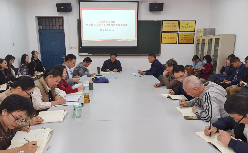 会上,窦峰领读了《习近平致全国优秀教师代表的信》,并谈了自己的学习体会,他说,习近平总书记在致全国优秀教师代表的信充分肯定了教师在为党育人为国育才和为国家发展、民族振兴作出的重要贡献,概括了教育家精神,指出了教师的使命志向和抱负,激励广大教师自信自强、踔厉奋发,为强国建设、民族复兴伟业作出新的更大贡献。习近平总书记教师节重要指示为新时代教师队伍建设指明了前进方向,提供了根本遵循。希望全体思政课教师要牢记为党育人、为国育才初心使命,坚持立德树人,增强“四个意识”,坚定“四个自信”,做到“两个维护”,加强师德师风建设,提升综合素养,不断改进和提高思政课教学水平。