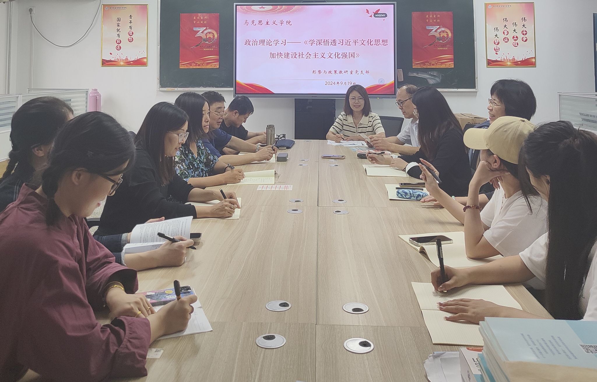 9月19日下午,形势与政策教研室党支部全体党员在综合楼313办公室集体进行政治理论学习,此次学习的主题为《学深悟透习近平文化思想,加快建设社会主义文化强国》。会议由形势与政策教研室党支部书记孟慧敏主持。